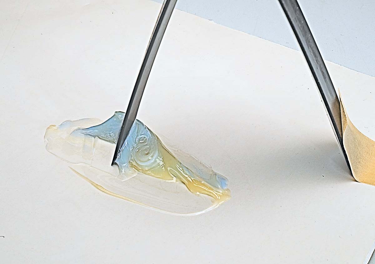 | To maintain the proper ratio, measure out the recommended amounts of the resin and hardener side by side. | Use a square-tipped spatula and combine the two parts in a swirling motion. |