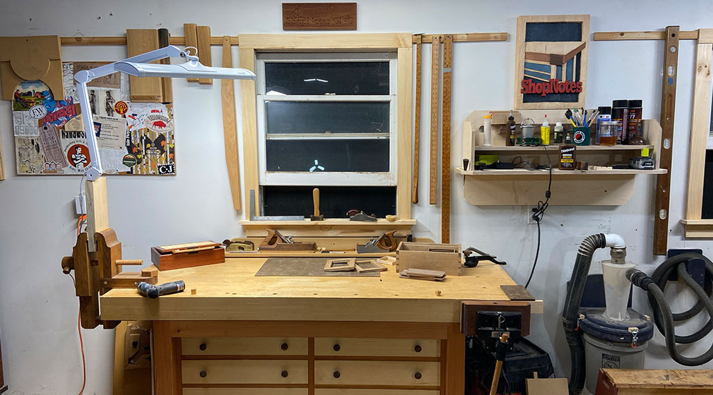 an LED bench light. I don't know, it's about two feet wide. I can adjust the brightness on it and it's got the adjustable like Pixar arm on it or whatever. And I had it on a little base that fit into a dog hole on my bench, but just put that at the wrong height. It was like, oh, it's headbutton that thing. So I made a bracket for it and was able to screw that to my new window casing. And now I have the light